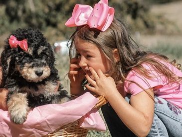 Our facilities are designed to provide our Bernedoodles with a safe, comfortable, and stimulating environment. We have our whelping area set up inside my dining room! We own a farm, so our Bernedoodles have large outdoor play areas where they can run and play. We also have an excellent relationship with an off-site veterinary clinic and a team of experienced vet techs to ensure that our Bernedoodles receive the best possible care.